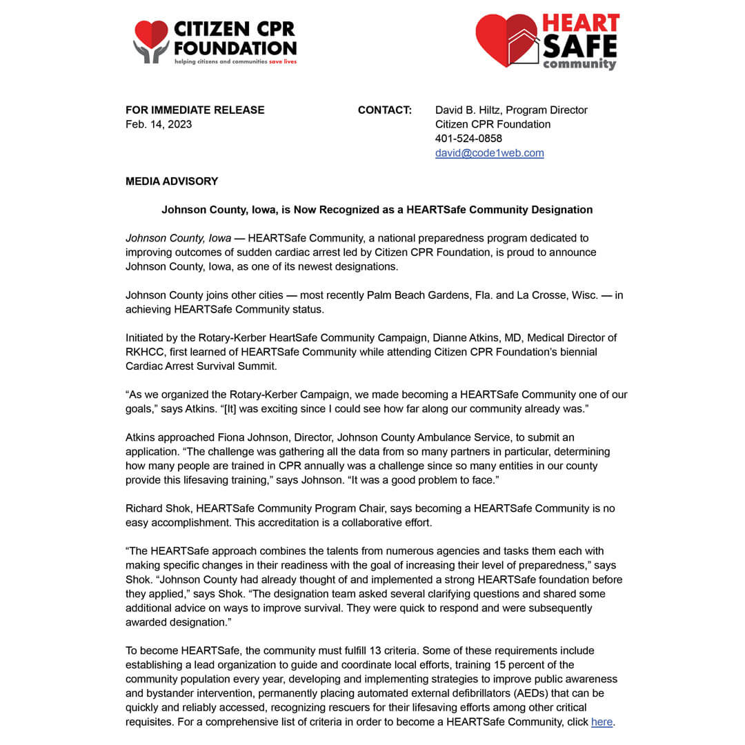 Johnson County, Iowa has been designated as the fourth HeartSafe Community in the United States!